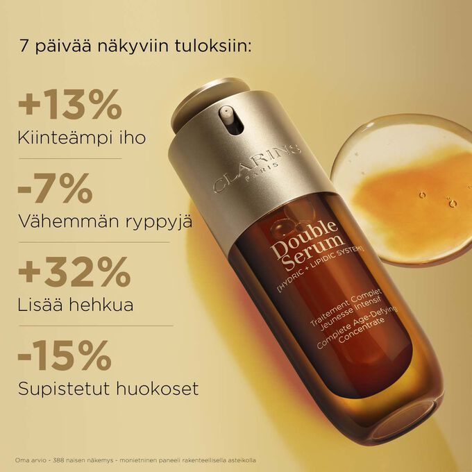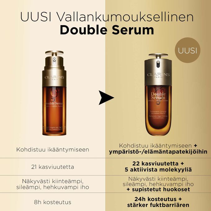Double Serum vaikuttaa sekä ihon luonnolliseen ikääntymiseen että elintapojen ja ympäristön aiheuttamiin ikääntymisen merkkeihin