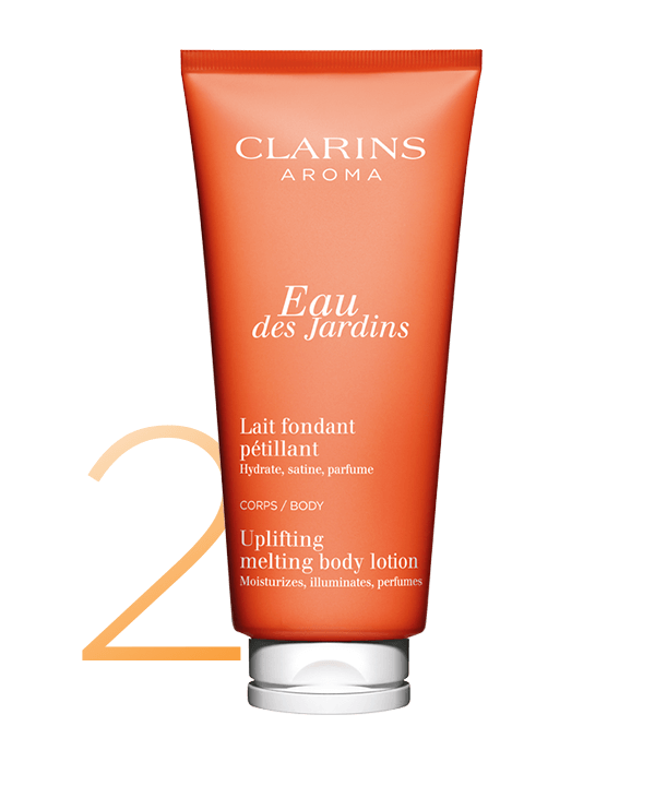 Tuoksuva vartalovoide, jossa on Eau des Jardinsin eteeristen öljyjen virkistävä tuoksu.