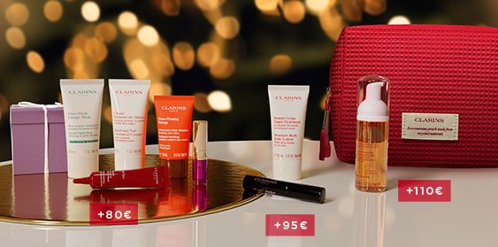 Glow and Flow on Clarinsin itsehoidon kauneusboxi — täydellinen kasvojen ja vartalon hoitorutiini, johon kuuluu tyylikäs ruostumattomasta teräksestä valmistettu vesipullo Exercere-brändiltä.